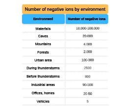 Research has shown that indoor air has only 20-50 ions per cm3, indoor vehicles about 5 ions per cm3, cities about 100-300 ions per cm3, industrial environments 90-100 ions per cm3, while nature boasts 50,000 to 200,000 ions per cm3 near waterfalls; about 4,000 ions per cm3 in the mountains; and somewhere up to 2,000 ions per cm3 in forests.