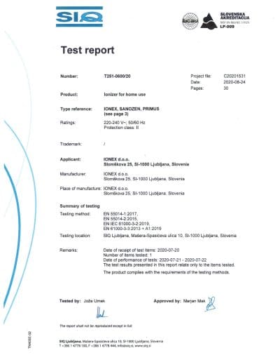 - Najmočnejši in najmanjši ionizatorji zraka za bivalna in delovna okolja (modeli Potencial, IONEX, Sanozen in Primus), še posebej primerni za osebe z alergijami, astmo, hipertenzijo