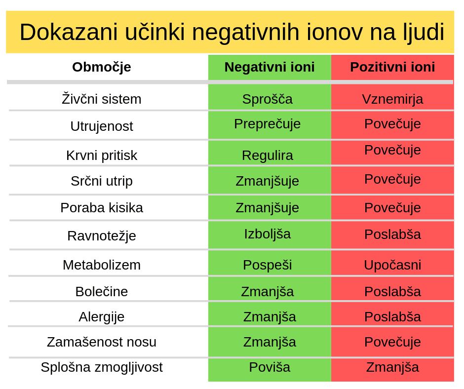 Poleg tega imajo negativni ioni ugoden vpliv na telo, ker zmanjšujejo vse respiratorne in bronhialne težave, prehlade, astmo, alergije, zmanjšujejo raven stresnega hormona, uravnavajo tlak, utrip ter povečujejo koncentracijo, ugodno počutje in boljše spanje.